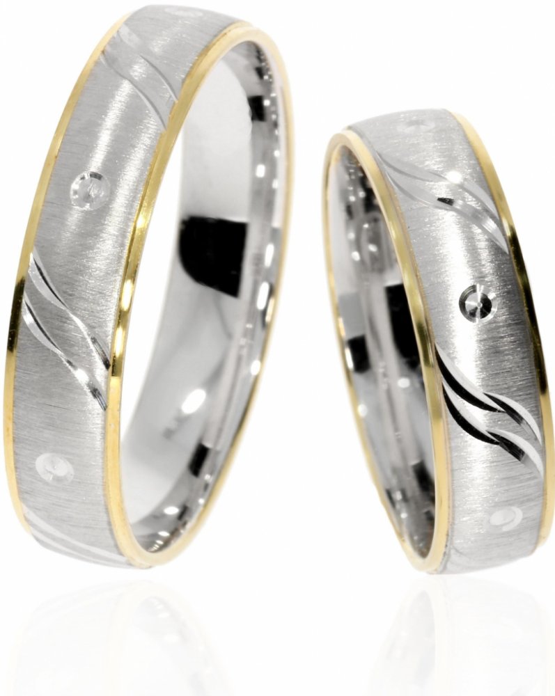 - Zlaté kombinované snubní prsteny, zdobené matováním a lesklým rytím