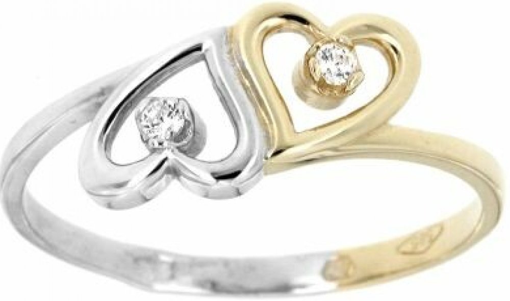 Ozdoba prstenu má tvar dvoubarevného srdíčka, které je doplněno dvěma bílými zirkony.
