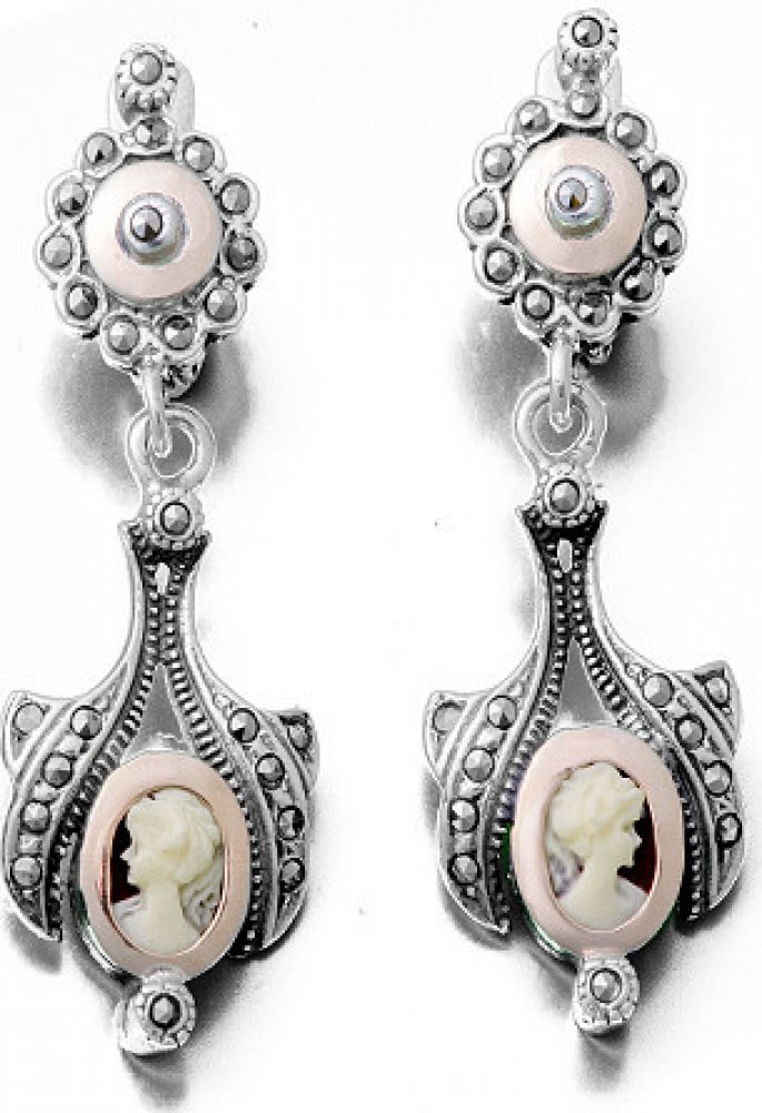 Luxusní visací náušnice s kamejí a markazity, portugalské stříbro. Visací náušnice z portugalského stříbra, které jsou do detailu propracované. Vrchní část zdobí tvar květu, spodní část krásná kamej s markazity. Originální šperk vhodný zejména pro společenské události.