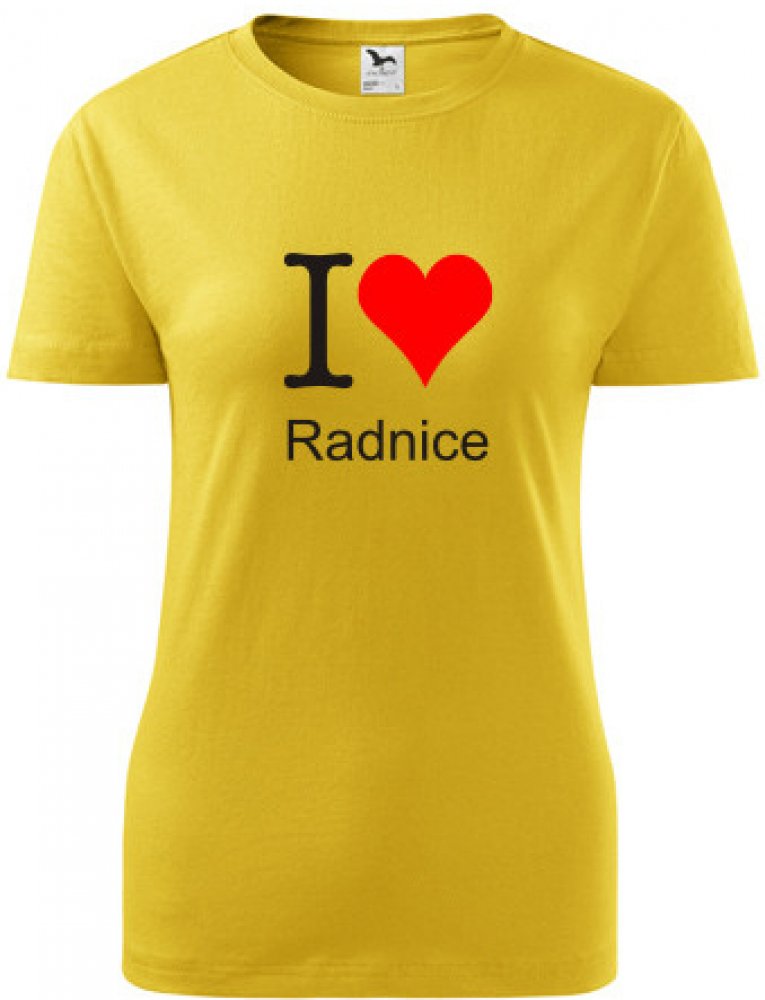 Žluté dámské tričko I love Radnice. nabízené velikosti jsou S,M,L,XL,XXL. Výběr z 12ti barev. Tričko patří do kategorií Trička I love - města ČR dámská, . Technologie potisku: Tisk na tričko je realizován pomocí termolisu a potisk je velice trvanlivý.