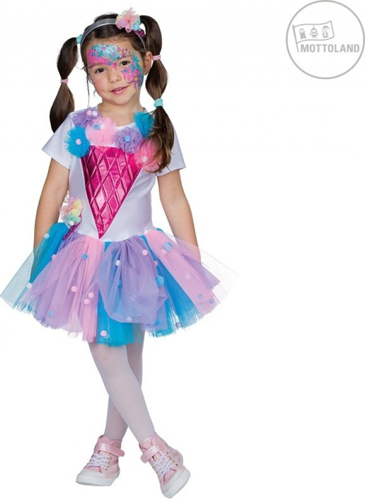 Šaty s krátkým rukávem a bílým topem, na kterém je prošíván růžový kornout zmrzliny. Kuličky zmrzliny jsou vyrobeny z barevných tylových rozet, které jsou zdobeny malými bambulkami. K sukni jsou připevněny barevné kousky tylu zdobené bambulkami. Mini verze zmrzlinového kornoutu jsou připevněny k pasu a čelence.