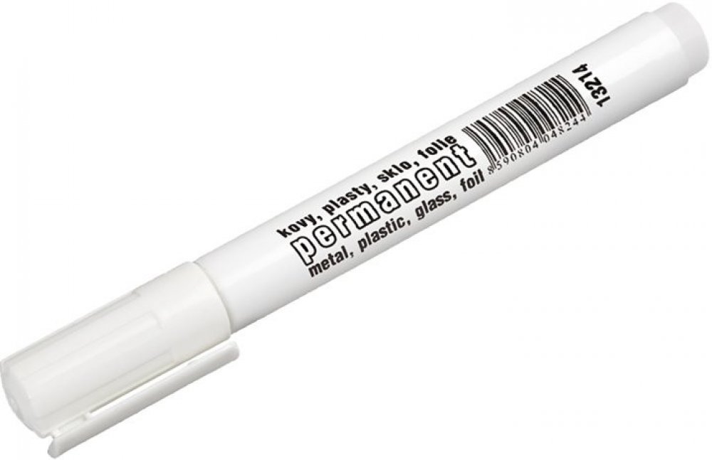 permanentní značkovač - fix bílý silný kulatý hrot - vhodné pro tmavé podklady - popisy dílů, lahví, tabulek.., dekorativní účely, atd.