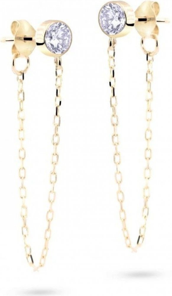Zlaté řetízkové náušnice s čirým zirkonem ve žlutém 14ti karátovém zlatě ryzosti 585/1000 na puzetový zápon. Celková délka je 3.2cm, průměr zirkonové ozdoby 4mm, váha 0.69g.