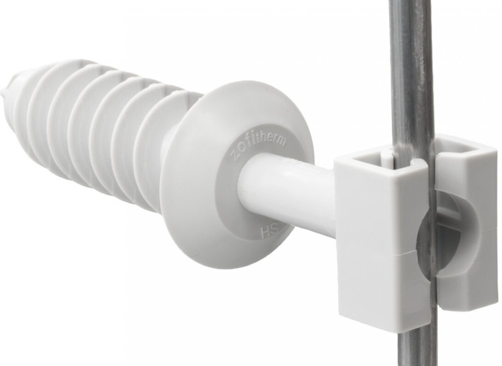ZOFITHERM HP hmoždinka s plastovou podpěrou hromosvodu zajišťuje, pevný, elegantní a funkční způsob uchycení hromosvodového drátu průměru 8mm na zateplené fasádě. ZOFITHERM HP eliminuje nežádoucí tepelné mosty a zajišťuje pevné spojení s fasádním tepelným izolantem a tím nenarušuje funkčnost fasádního zateplovacího systému.