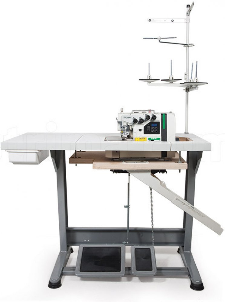 Smontovaný, kompletní průmyslový šicí stroj včetně podstavce se zabudovaným servomotorem o výkonu 550W (napájení 230V), stroj je připraven k okamžitému šití.