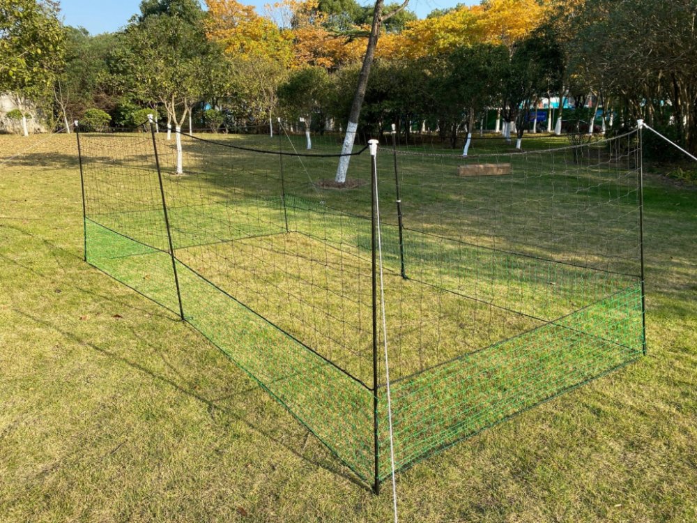 Ohradníková síť pro drůbež, kompletní souprava se snadnou instalací. Sada obsahuje:1 síť o rozměrech 12 m x 1,25 m s průměrem ok černé sítě 10 cm a zelené sítě 4,5 cm6 sloupků, 1 dveřní sloupek (pro snadné otevírání a zavírání), 1 dveřní díl včetně: 1 pružiny + 1 spojovacího dílu pro dveřní zárubeň6 dvojhrotů ve tvaru písmene H6 bílých krytů5 vypínacích lan se smyčkou16 kolíkůmodulární a propojitelné s jinými sítěmi stejného typuodolné vůči nepřízni počasípřizpůsobená síťovina ve spodní části poskytuje MAXIMÁLNÍ BEZPEČÍ a zabraňuje útěkům