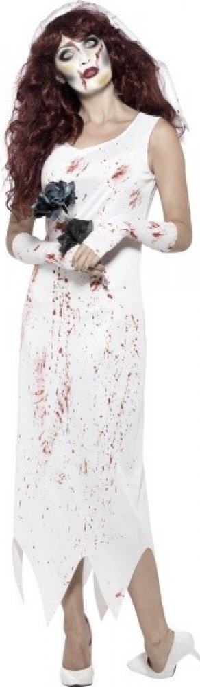 Dámský kostým zombie nevěsty se skládá z bílých zakrvácených šatů, návleků na ruce a závoje. Originální převlek na zombie walk nebo Halloweenský večírek.