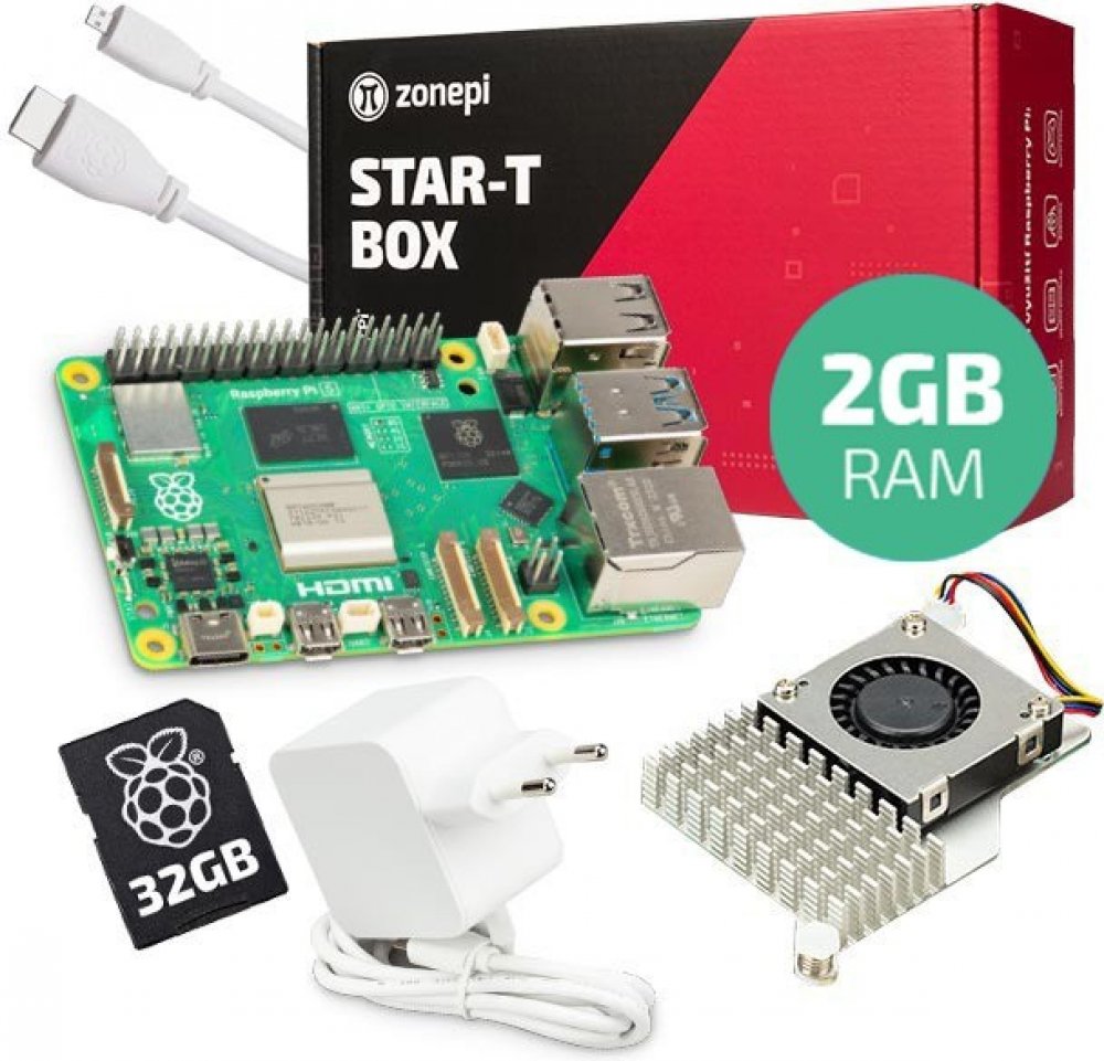 Oficiální startovací sada obsahuje Raspberry Pi 5 2GB RAM, chladič, 32GB micro SD A2 kartu s adaptérem a nainstalovaným Raspberry Pi OS, USB-C 5,1V/5A napájecí zdroj a 2metrový HDMI kabel. Veškeré příslušenství je od vaší oblíbené značky Raspberry Pi.