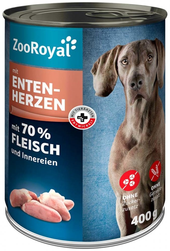 Prémiové krmivo ZooRoyal s kachními srdíčky je vydatná kompletní strava, která psovi poskytuje 70 % masa a vnitřností, což zaručuje šťavnatou masitou stravu.