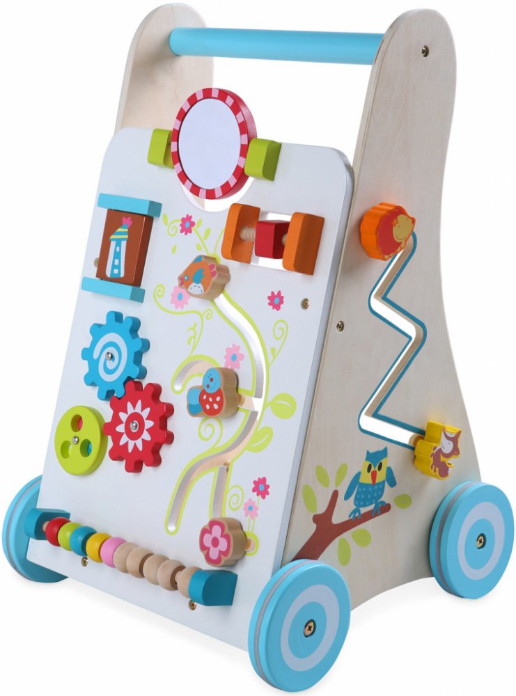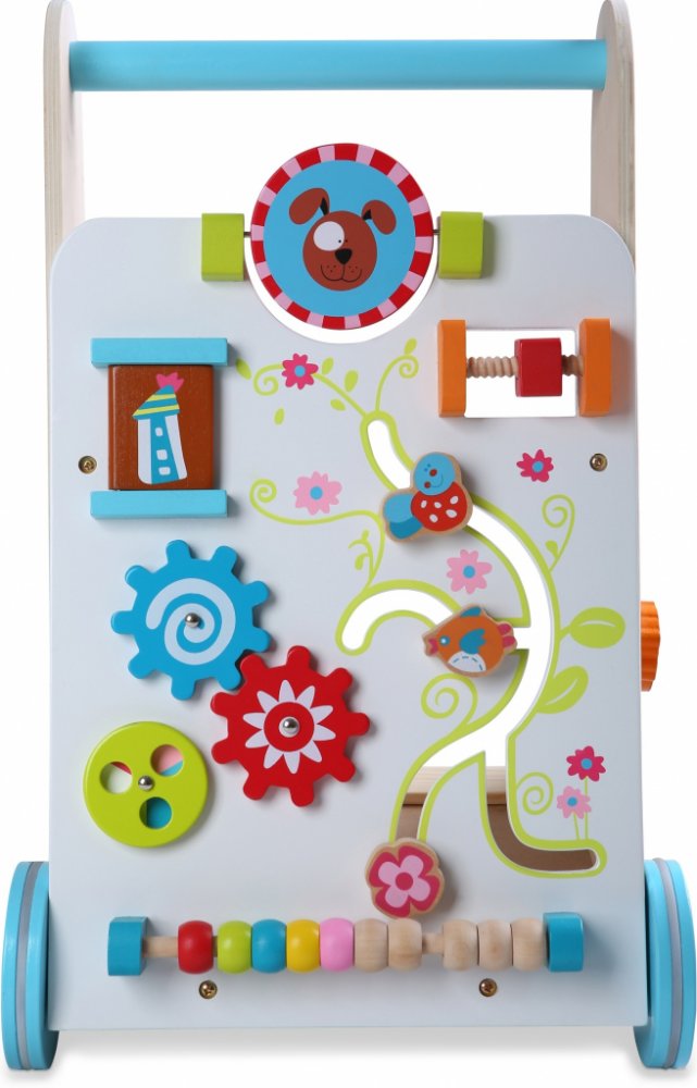 Dřevěné aktivity chodítko nejenže podporuje nácvik chůze, ale je také vybaveno mnoha prvky, které rozvíjejí koordinaci oko-ruka - váš mrňous zažije s chodítkem spoustu zábavy, ale také bude radostnou a poutavou hrou podporovat svůj psychomotorický vývoj. Součástí interaktivního panelu je posuvný labyrint a vkládačka, které pomáhají dětem rozpoznávat barvy, tvary, zvířátka a zároveň podporují jejich tvořivost.