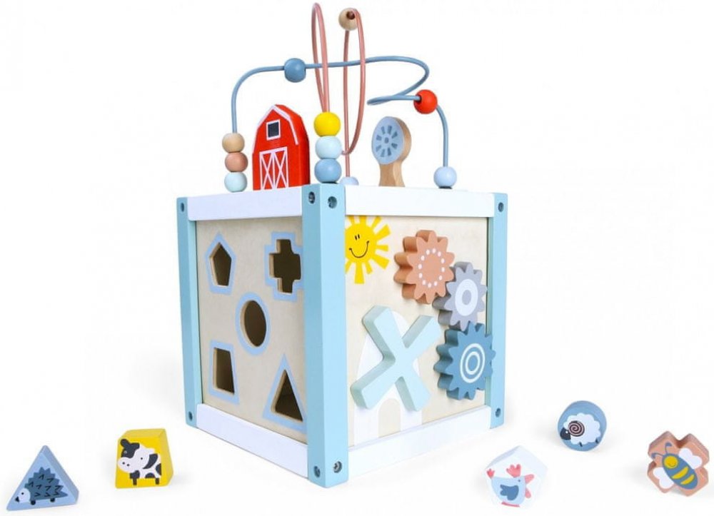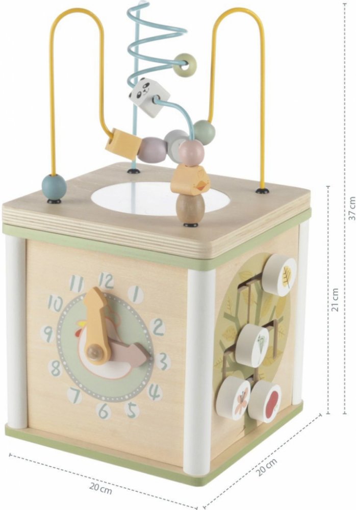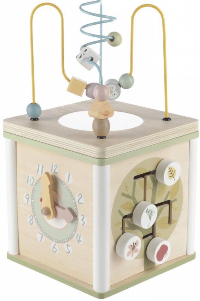 Roztomilá kostka, která v sobě ukrývá aktivity skládačku. Po stranách kostky jsou otočné dřevěné tvary s různými motivy. Hračka rozvíjí koordinaci, prostorovou představivost a dovednost rukou. Posouvání kuliček a tvarů také může děti naučit prvnímu počítání a rozpoznávání barev. Aktivity jsou vyrobené z kvalitního dřeva a barev na vodní bázi.