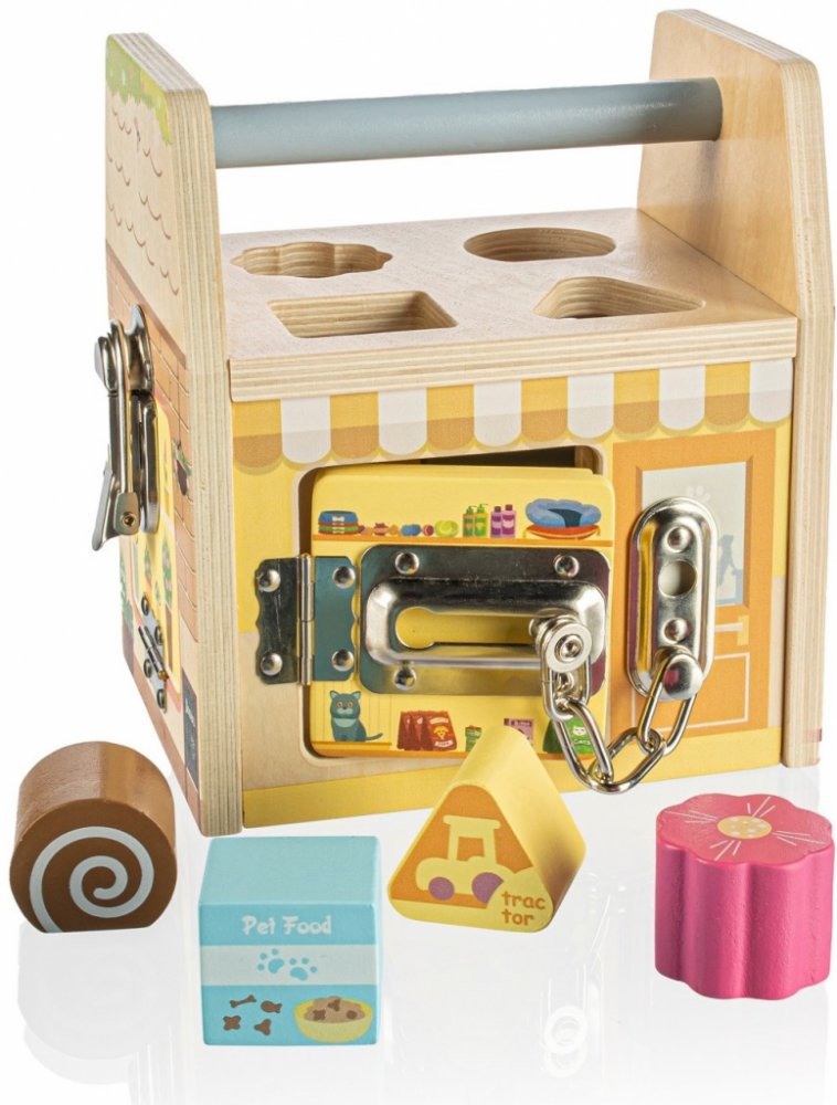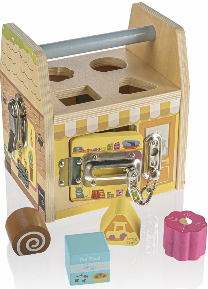 Každá strana této dřevěné kostky představuje jiný obchod a každý obchod, jak se patří má svůj speciální zámek proti lupičům. Děti se hraním si se zámečky učí logickému a prostorovému vnímání.