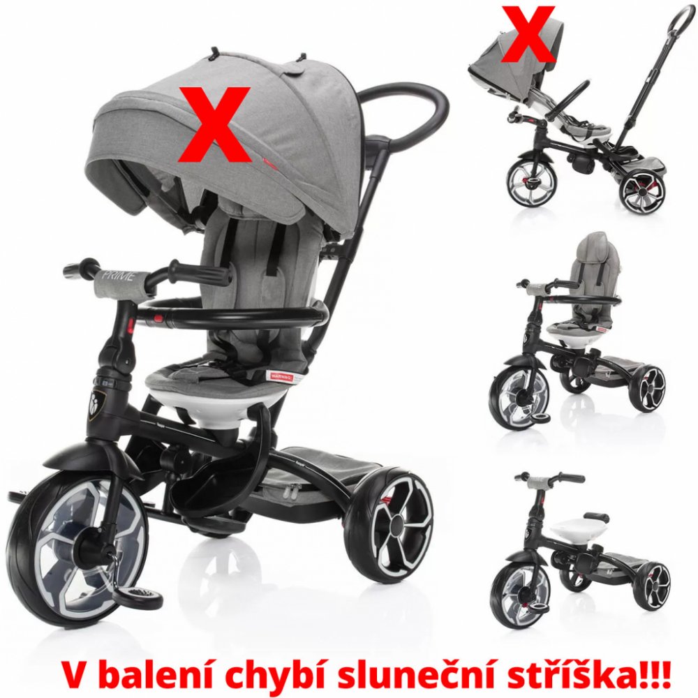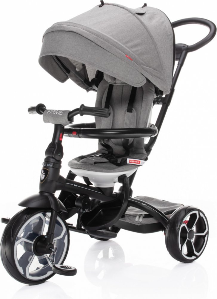 S tím, jak dítě roste a vaše potřeby se mění, tříkolka Prime nabízí možnost 4 režimů použití. V 1. režimu je dítě posazené směrem k rodiči, pedály a řídítka jsou odpojené. Ve 2. režimu je dítě naopak směrem od rodiče, přičemž pedály a řídítka jsou stále odpojené. 3. režim nabízí to, že dítě sedí směrem od rodiče, pedály a řídítka jsou zapojené s možností aktivního pohybu dítěte. A v posledním, 4. režimu sedí dítě obráceně, směrem od rodiče, pedály a řídítka jsou zapojené. Rodič už tříkolku neřídí, vodící tyč je sejmutá a dítě jede zcela samo.