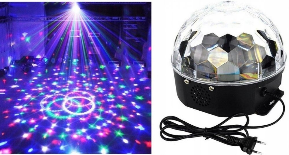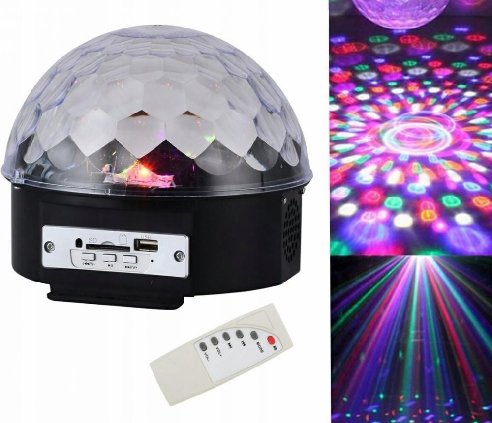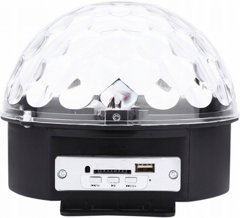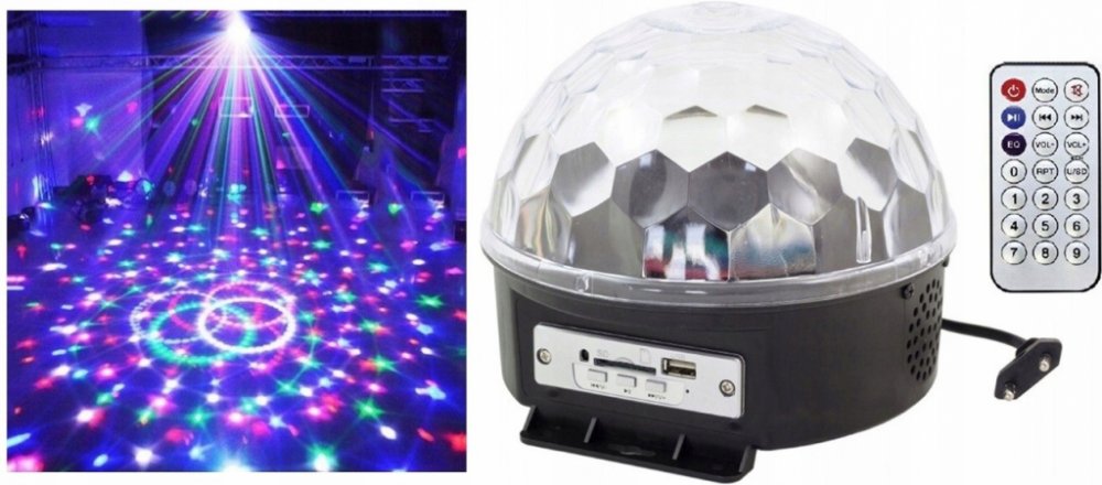 Diskotéková koule s vestavěným MP3 přehrávačem, čtečkou SD karet, USB portem a vysoce kvalitními stereo reproduktory. Zařízení je ovládáno tlačítky na panelu nebo pomocí dálkového ovládání.