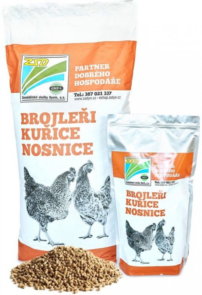 ošetřeno konzervanty proti znehodnocení nežádoucími mikroorganismy. SLOŽENÍ: Pšenice, Sojový extrahovaný šrot toastovaný(GMO), Kukuřice, Uhličitan vápenatý, Triticale, Ječmen setý,Řepkový extrahovaný šrot, Živočišný tuk, Dihydrogenfosforečnan vápenatý, Chlorid sodný. Vyrobeno s použitím výrobků z geneticky modifikované soji. Způsob užití: Kompletní krmivo se zkrmuje jako jediné krmivo se zajištěním dostatku kvalitní pitné vody. Se zkrmováním se začíná jeden týden před zahájením snášky. Orientační spotřeba směsi na kus a den je 100 - 120 g .