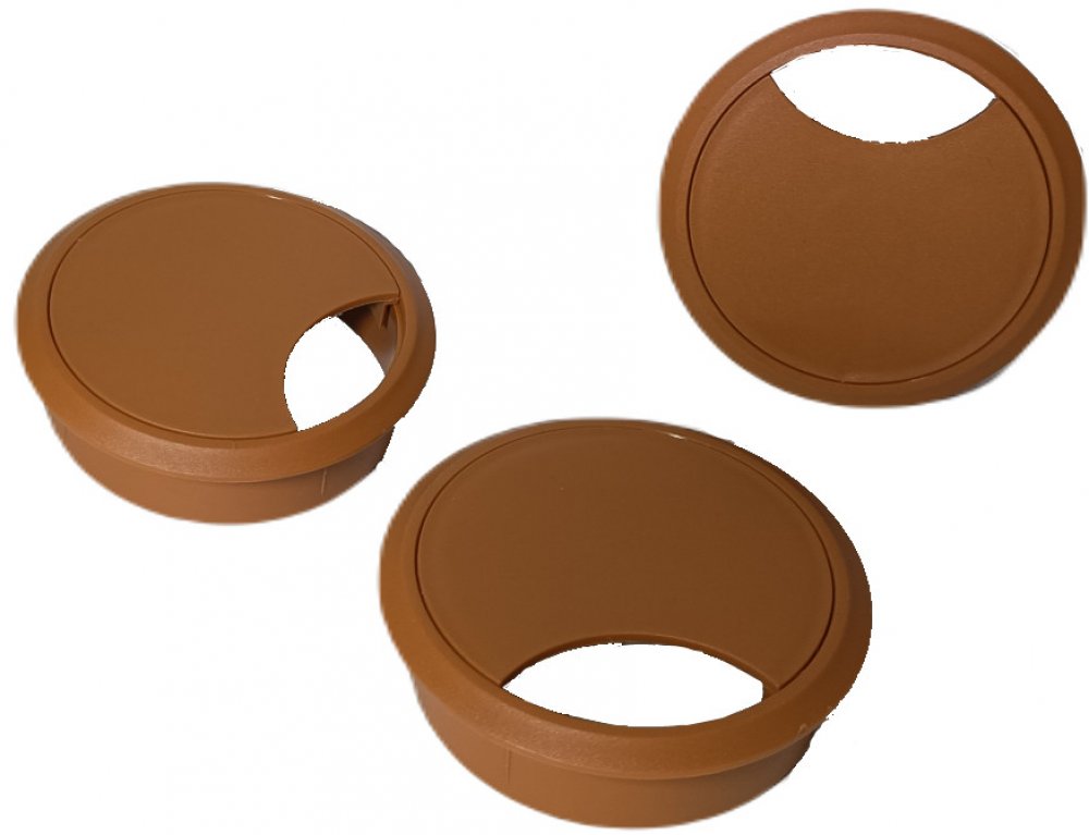 Dvoudílná kabelová průchodka s průměrem 70 mm slouží jako elegantní řešení k bezpečnému vedení kabelů skrz stoly či další nábytek.
