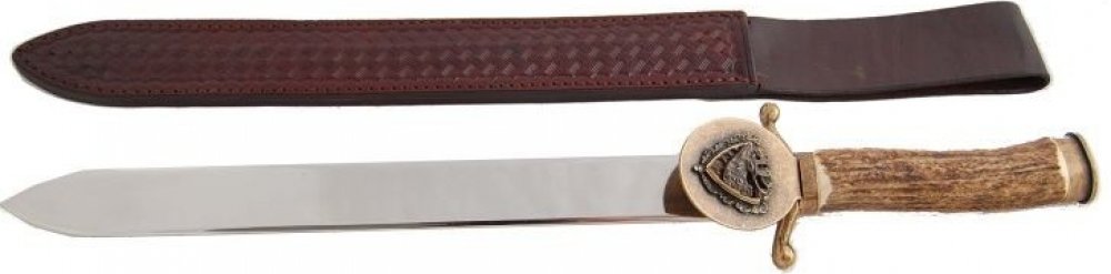 Lovecký pasovací tesák jelen: nerezová čepel, parohová rukojeť, na zášti motivy zvěře.
