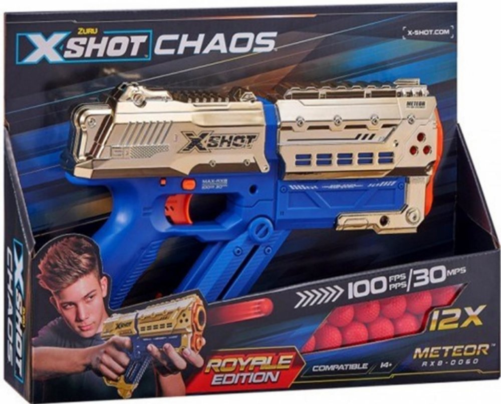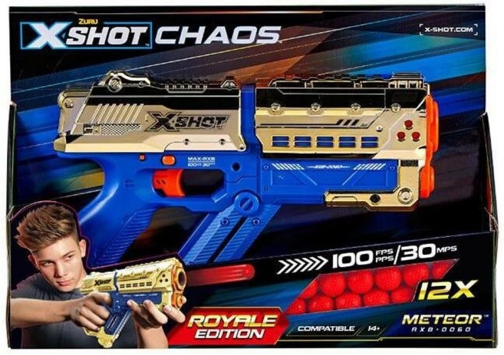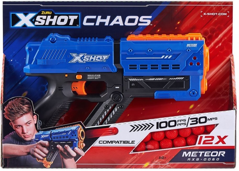 Dodává se s 12 náboji chaosu + nálepkou.X-Shot Chaos Meteor RXB-0060 je malá pružinová pistole s vnitřním zásobníkem. Vnitřní zásobník pojme 6 nábojů. Tato kola jsou kompatibilní s Nerf Rival. Zásobník se plní ze spodní strany. Blaster má zámek spouště a střílí na 100 FPS.