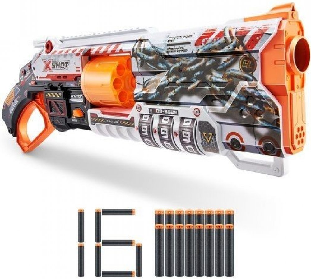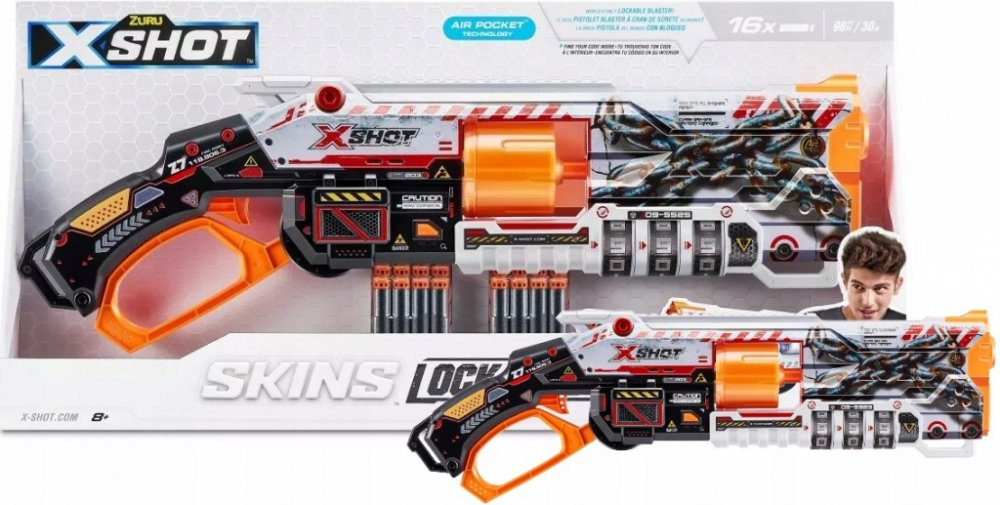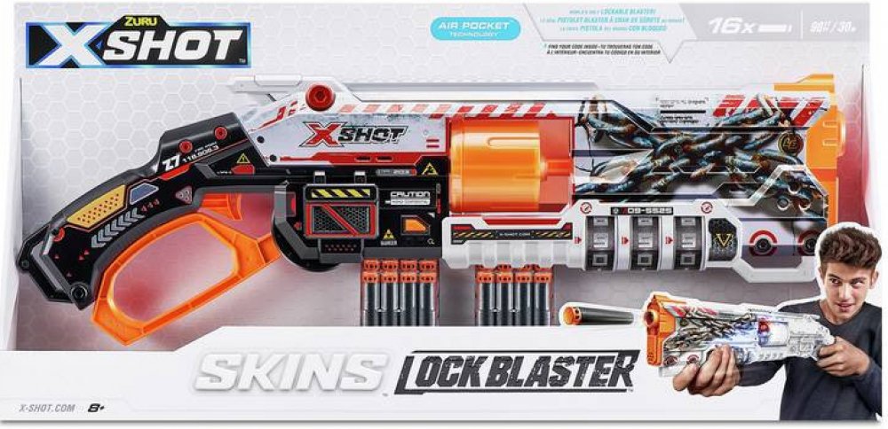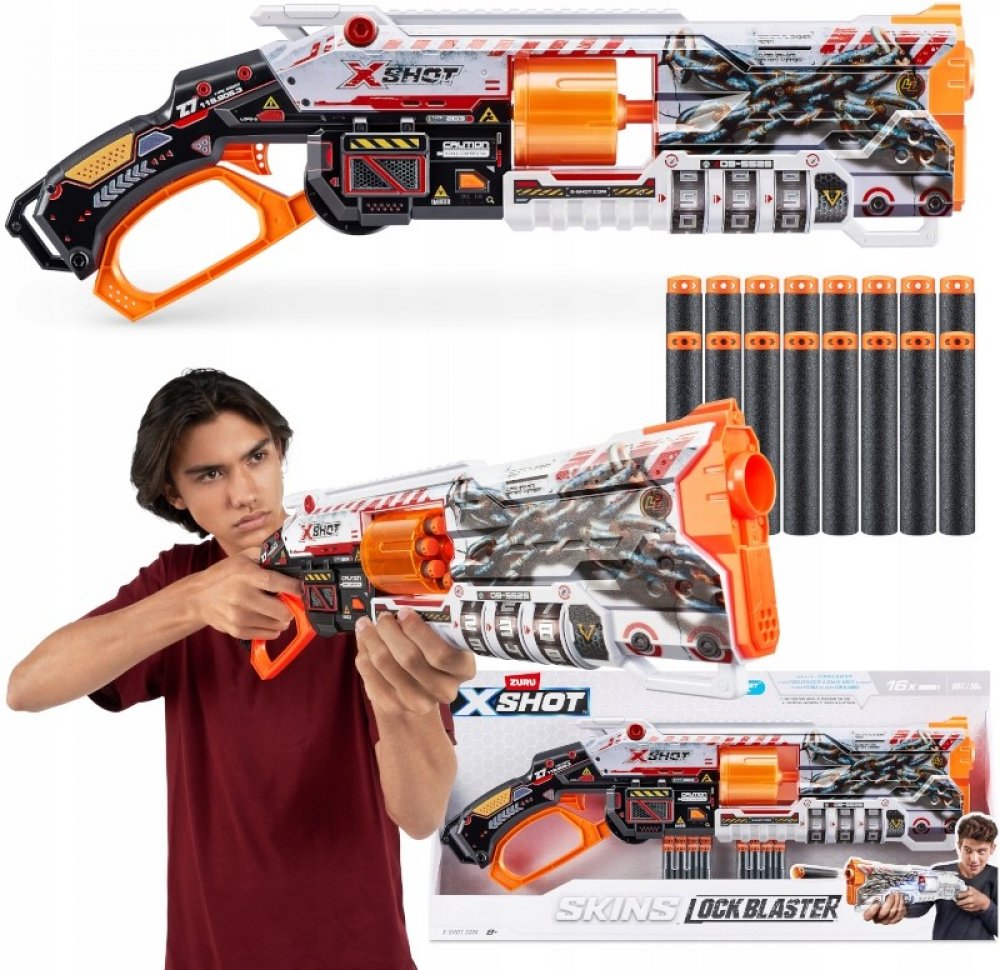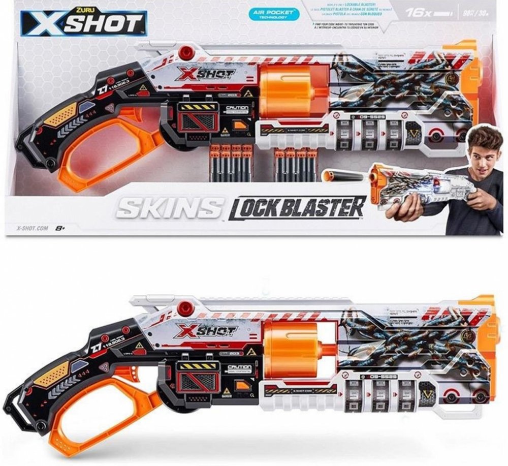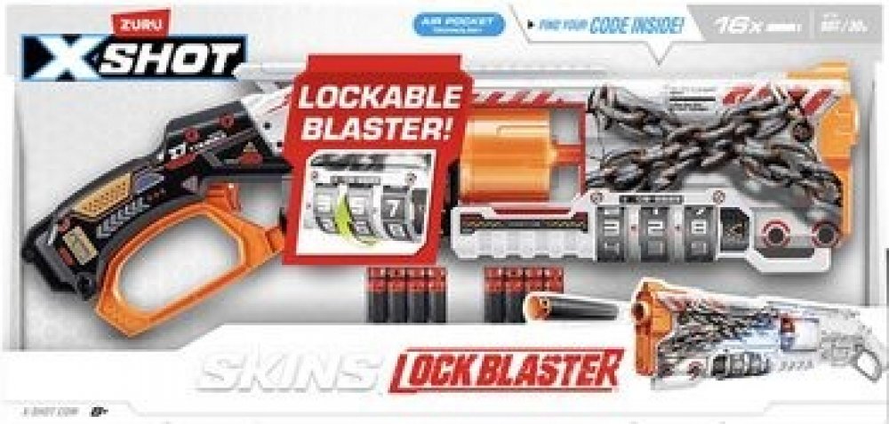 Rozměr balení cca 60 x 28 x 6,5 (D x V x Š).X-Shot Skins Lock Blaster dává sílu do vašich rukou! Každý Lock Blaster je dodáván s QR kódem, který odhalí vaši jedinečnou kombinaci zámku. Odemkněte svůj blaster a začněte se bavit! Lock Blaster má otočnou hlaveň se 6 šipkami, která prostřelí šipky během několika sekund a zasáhne cíle až do vzdálenosti 27 m / 90 stop! Až bitvy skončí, uzamkněte svůj blaster a nikdo jiný jej nebude moci použít. Vyberte si jiný, zvolte X-Shot Skins.Locking Blaster: X-Shot Skins Lock Blaster lze použít pouze po odemčení. Nedovolte nikomu znovu použít váš blaster bez povolení tím, že jej po použití uzamknete.