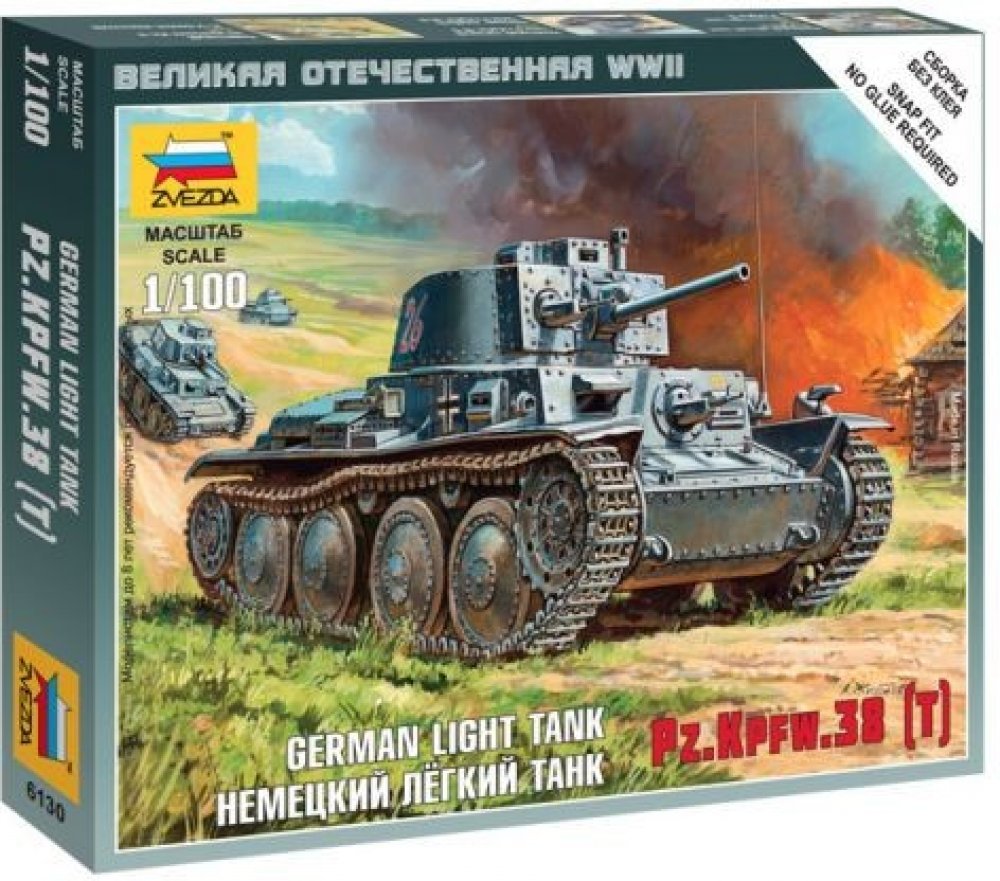 Plastikový model Zvezda 6130 – německý lehký tank Panzerkampfwagen Pz.Kpfw 38(t) v měřítku 1:100. Stavebnice obsahuje 7 dílků, délka 47 mm, obtížnost 2.