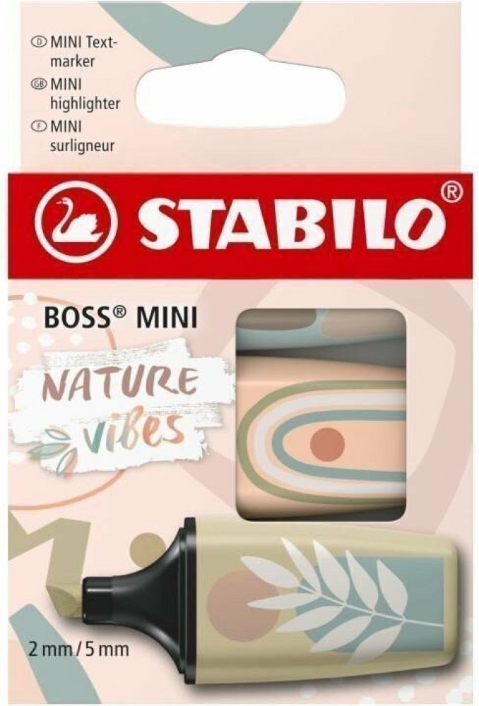 Mini zvýrazňovače STABILO BOSS MINI Naturevibes jsou k dispozici v šesti jemných tlumených odstínech, které jsou inspirovány paletou barev přírody. Každý ze zvýrazňovačů je na zadní straně potištěn organickým designem. Trendové motivy navrhla cílová skupina - Gen Z pro Gen Z. Kombinace tlumených barev s organickými motivy je přesně to, co milovníci psaní, kteří sledují trendy, hledají. Ve známé a osvědčené kvalitě STABILO, je zvýrazňovač spolehlivým společníkem ve škole i v práci. Hrot nabízí dvě šířky stop – 2 a 5 mm. Díky STABILO Anti-Dry-Out Technologii proti vysychání lze mini zvýrazňovač používat bez uzávěru až 4 hodiny - pro koncentrovanou, bezstarostnou práci.