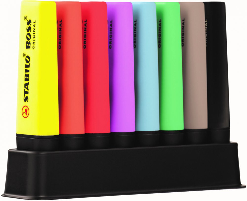 Zvýrazňovače využijete nejen v každé kanceláři, ale poslouží i dětem ve škole. Jestliže si rádi označujete důležité věci v textu, zvýrazňovač STABILO bude pro vás ten pravý. Černá, červená, hnědá, modrá, oranžová, růžová, zelená a žlutá barva zvýrazňovače se nerozmazává, takže dokument můžete bez obav vložit do kopírky. Zkosený tvar hrotu umožní kreslit silné a slabé linky. Je-li řeč o velikosti stopy, tak ta u zvýrazňovače STABILO dosahuje šířky 5 mm. V balení naleznete 8 ks zvýrazňovačů. Zajímavé vlastnosti zvýrazňovače STABILO BOSS ORIGINAL deskset 8 ks Se zvýrazňovači si snáze zapamatujete důležité informace v textu Zkosený tvar hrotu pro lepší manipulaci Barvy: černá, červená, hnědá, modrá, oranžová, růžová, zelená a žlutá Zvýrazňovač STABILO s nesmazatelným inkoustem Počítejte se šíří stopy 5 mm V balení se nachází 8 ks zvýrazňovačů