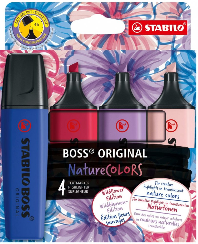 Zvýrazňovač STABILO BOSS ORIGINAL NatureCOLORS Wildflower nabízí moderní odstíny a jemný efekt zvýraznění, které oživí každý dokument nebo studijní materiál