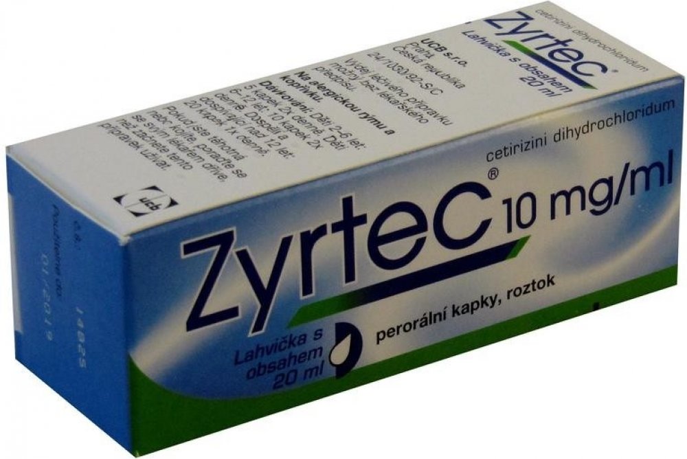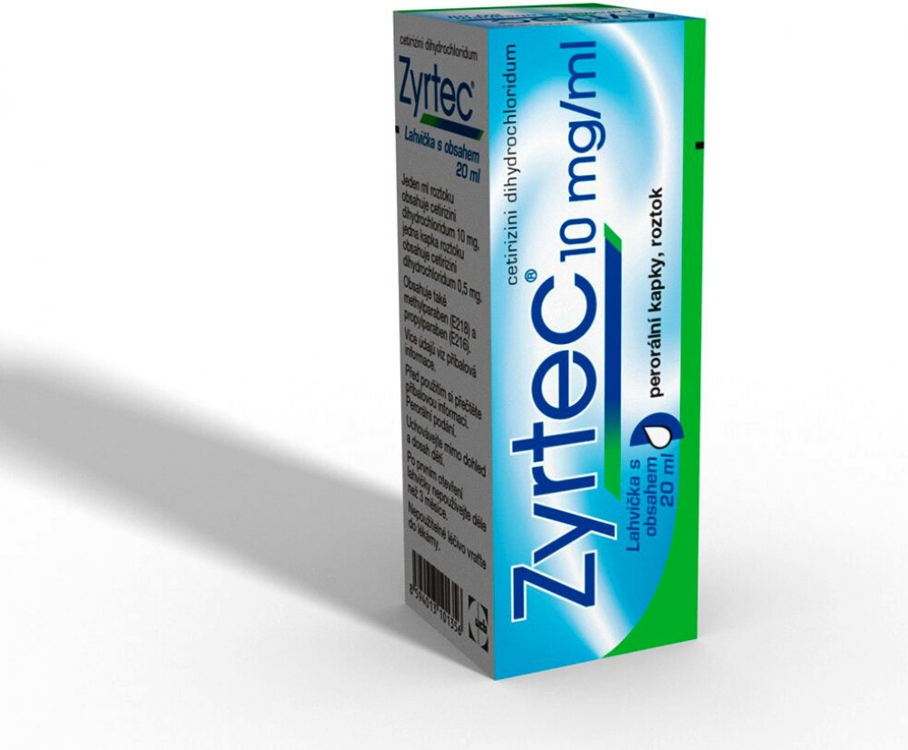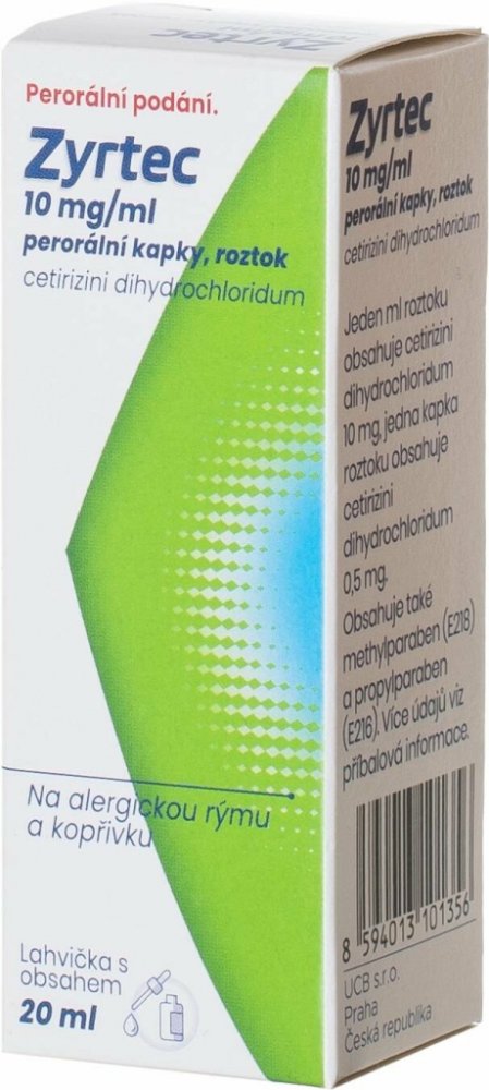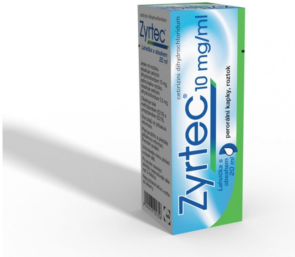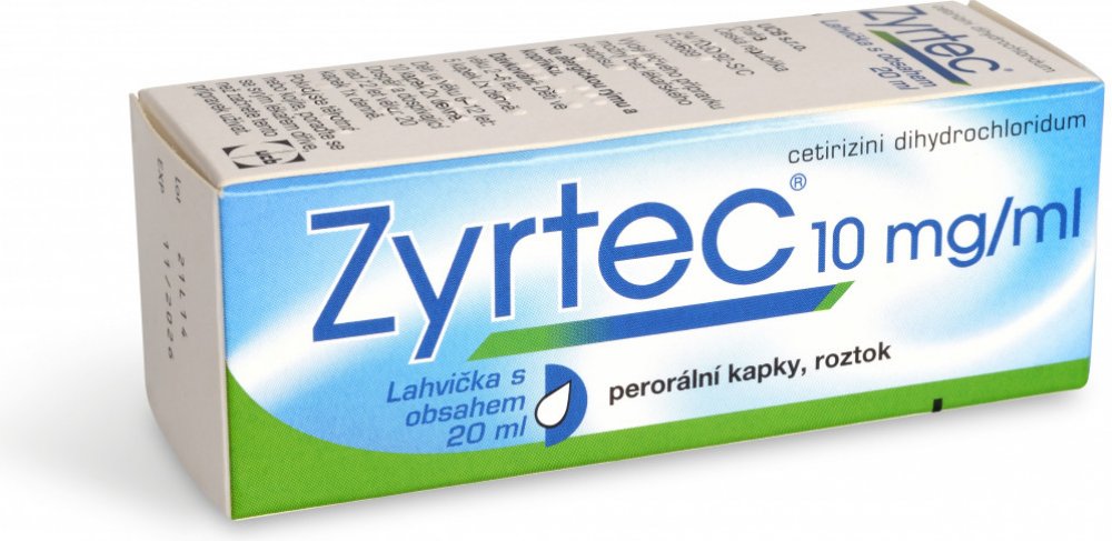 Léčivý přípravek obsahující cetirizin. Název přípravku: Zyrtec 10 mg/ml perorální kapky, roztok