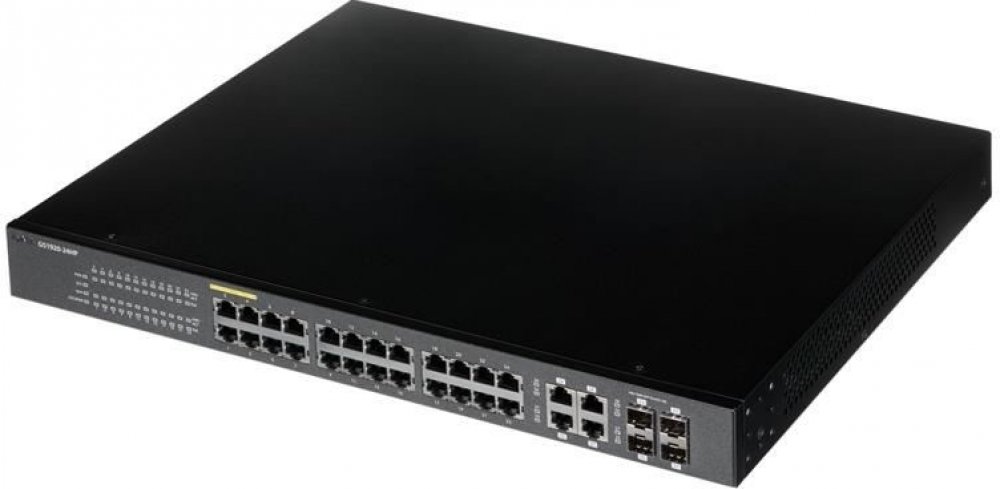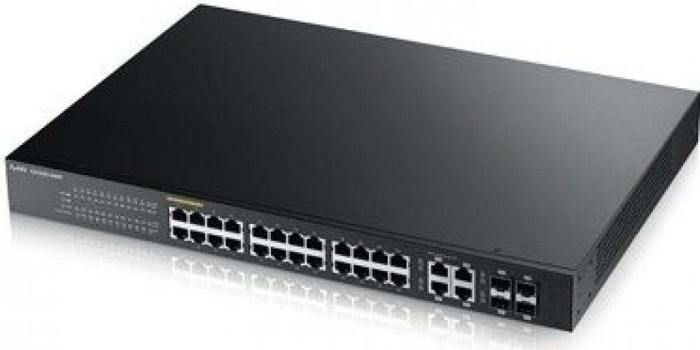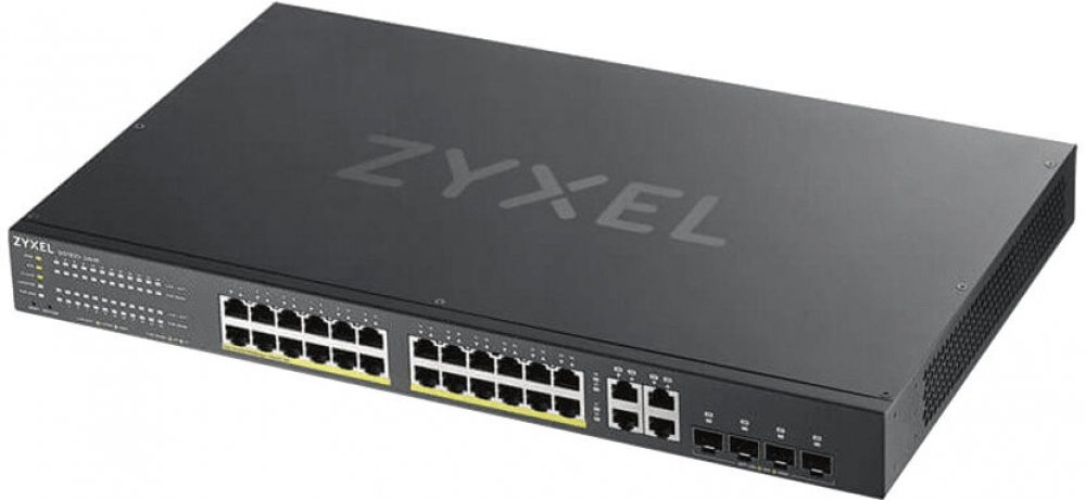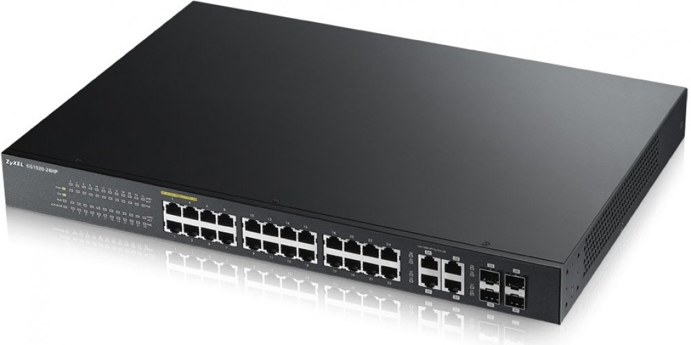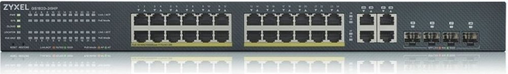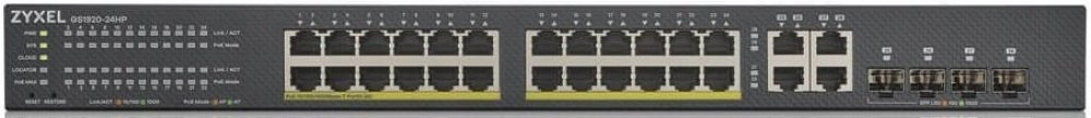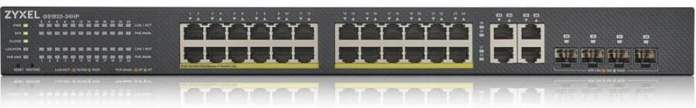 GS1920-24HPv2, 28 Port Smart Managed PoE Switch 24x Gigabit Copper PoE and 4x Gigabit dual pers., hybird mode, standalone or NebulaFlex Cloud, 375 Watt PoE
